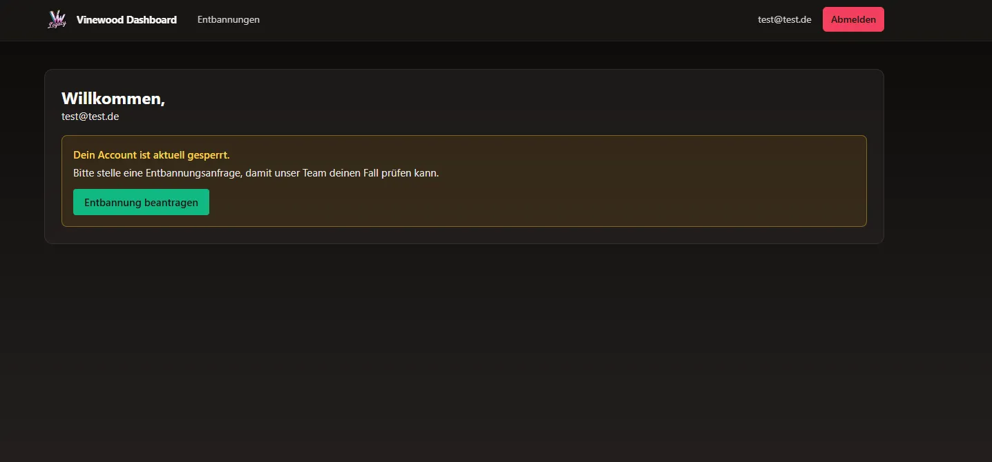 Darüber hinaus wird das Dashboard auch für Entbannungsanträge genutzt. Über das System können wir Benutzer sowohl vom Discord als auch vom Server bannen — gleichzeitig bleibt jedoch ein Kanal offen, über den betroffene Spieler sich melden können, falls ein Bann fälschlicherweise verhängt wurde. So stellen wir sicher, dass wir auch nach einem Bann erreichbar bleiben und Fälle, in denen die falsche Person betroffen ist, transparent und nachvollziehbar prüfen können.
